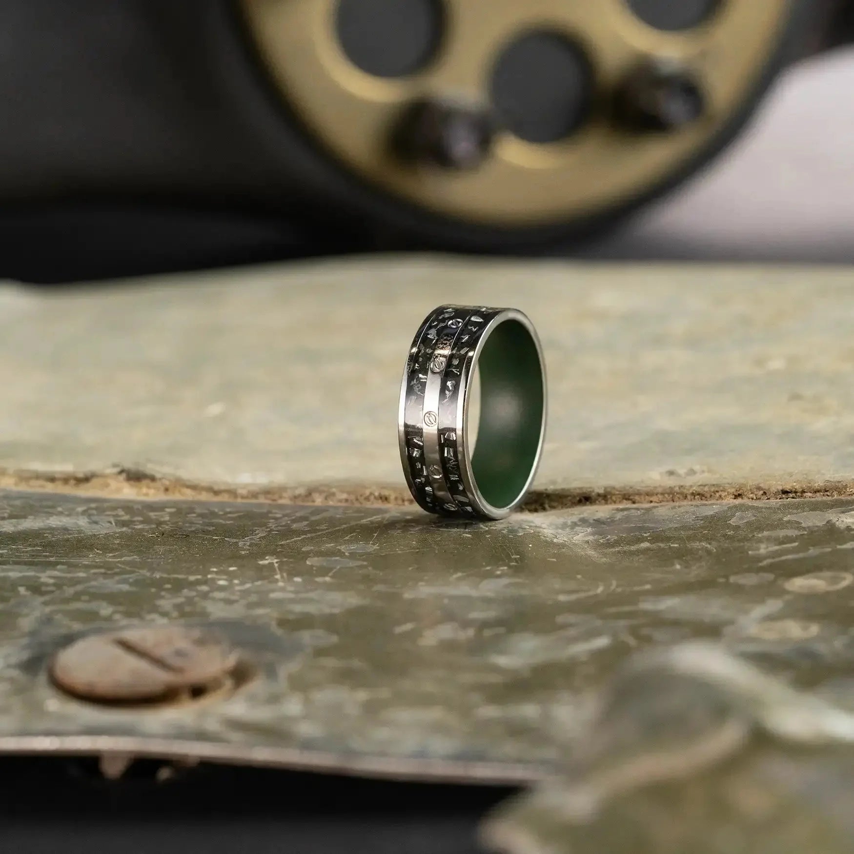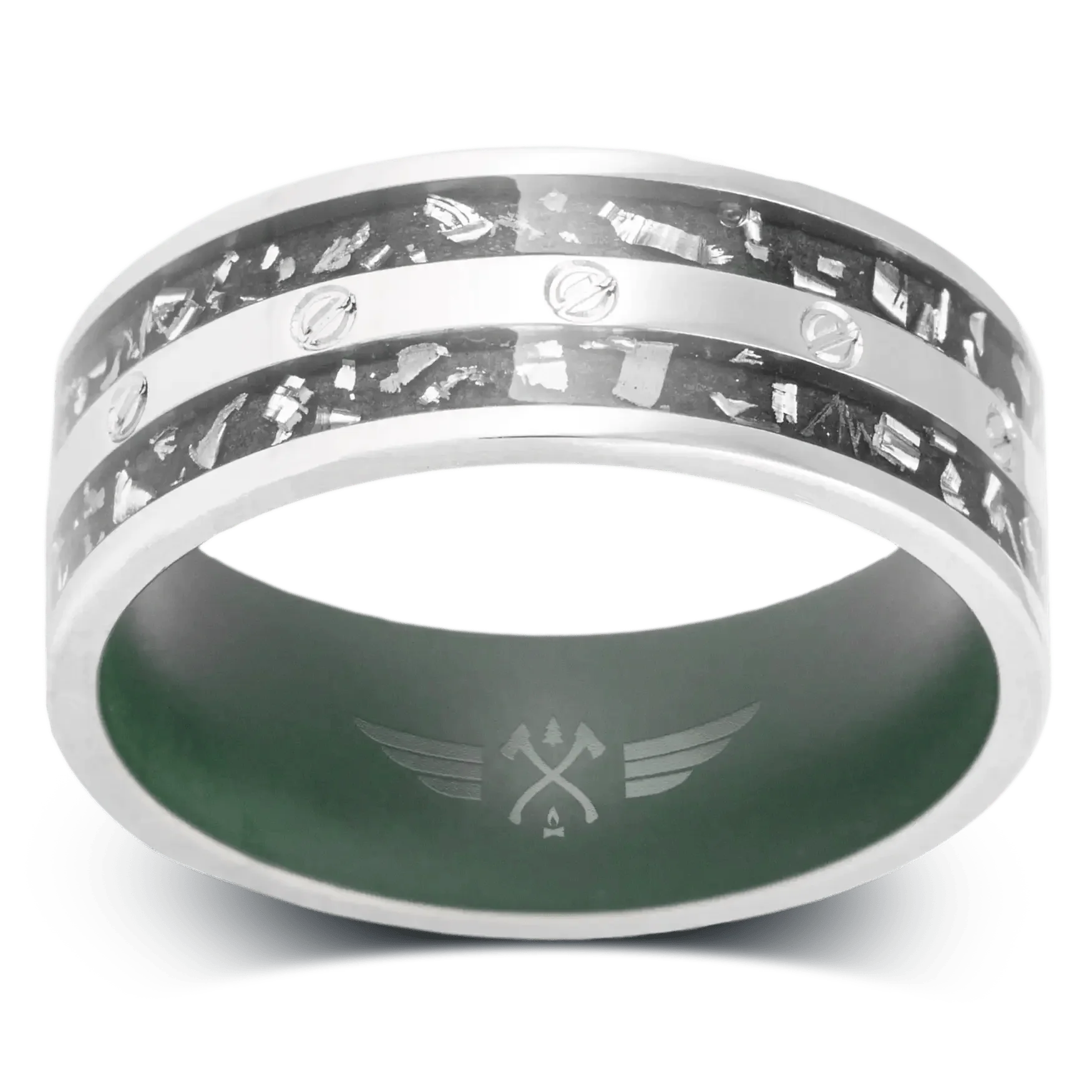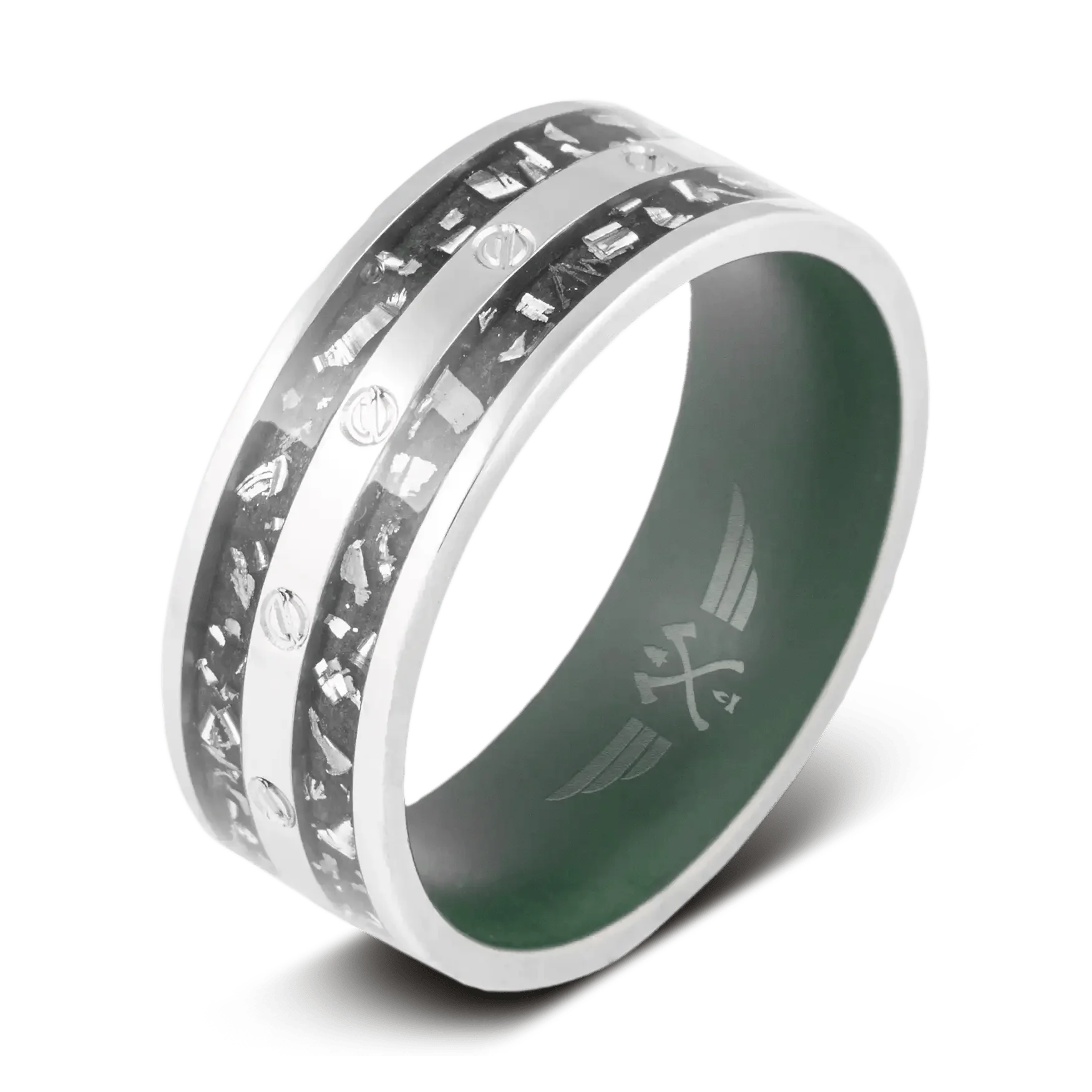 - Titanium with Double P-51 Mustang Metal Shred Inlays, Screw Rivet Design, and Green Cerakote Sleeve